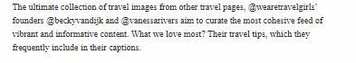 “The ultimate collection of travel images from other travel pages, @wearetravelgirls’ founders @beckyvandijk and @vanessarivers aim to curate the most cohesive feed of vibrant and informative content. What we love most? Their travel tips, which they frequently include in their captions.” ~ Donna Kim, Harper’s Bazaar
